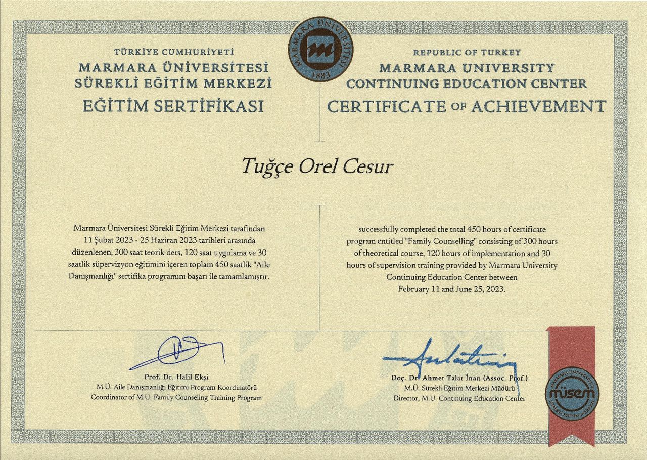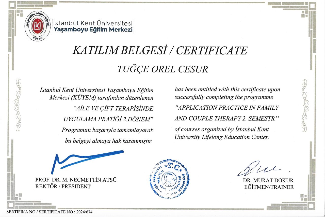 Marmara Üniversitesi tarafından verilen ‘Aile Danışmanlığı’ programını tamamlayarak Aile Danışmanı unvanını almıştır. Dr. Murat Dokur tarafından verilen ‘Aile ve Çift Terapisi’ eğitiminin 3 yılı kapsayan temel ve ileri seviye modüllerini tamamlamış olup, süpervizyon sürecindedir. Bilişsel ve Davranışçı Terapi süpervizyonunu Prof. Dr. Gülsen Erden’den, Çocuk Merkezli Oyun Terapisi süpervizyonunu Uzm. Psikolojik Danışman Filiz Çetin’den almıştır.